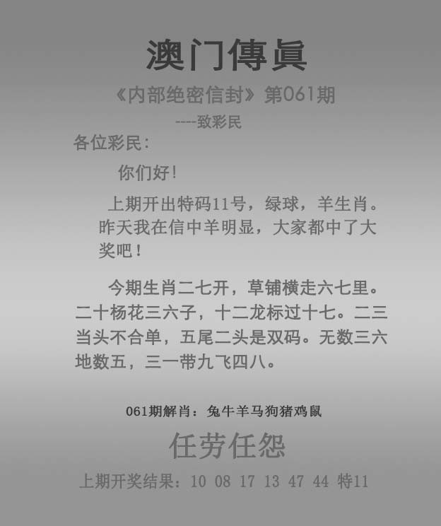 061期:澳门传真四字解开?00 【声东击西】 解:声东击西,解肖:龙鸡马鼠虎牛 ============================ 060期:澳门传真四字解开狗09 【前程万里】 解:前程万里,解肖:鼠虎牛龙狗马 ============================ 059期:澳门传真四字解开鸡10 【两袖清风】 解:两袖清风,解肖:鸡狗马鼠虎牛 ============================ 058期:澳门传真四字解开鼠31 【两袖清风】 解:两袖清风,解肖:鸡狗马鼠虎牛 ============================ |